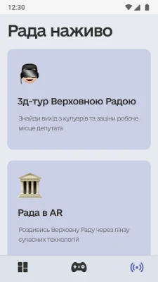 The application allows you to visit the Verkhovna Rada from anywhere in Ukraine and watch 3d model of the Verkhovna Rada building at home, thanks to the augmented reality function. In addition, you will be able to check how you can be a deputy and even go through the procedure of adopting the laws of Ukraine.